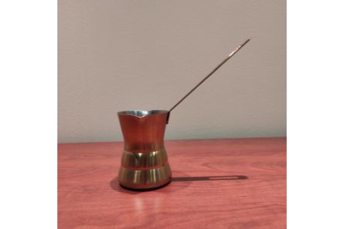 турка стальная с позолотой 160 мл - на две порции, диаметр 6 см, высота 8,3 см, толщина стенок 0,8 мм, ручка 11 см