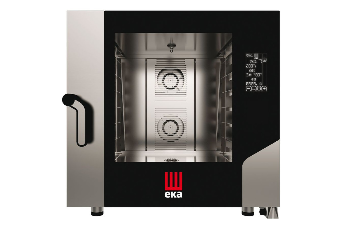 Печь, 4 уровня 600х400 (противни в комплект не входят), расстояние 80 мм, сенсорная панель управления Black Mask, 100 ячеек для программ (10 шагов), 40 готовых рецептов, регулируемое пароувлажнение (инжектор, шаг 10%), таймер, темп. +30 +270С, 1 вентилятор с реверсом (3 скорости + 1 полустатическое положение), 7,8кВт, 380В, регулируемые по высоте ножки