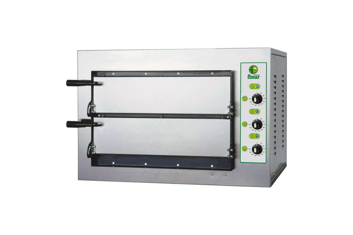 Профессиональная электрическая подовая печь для выпечки пиццы, лепешек и т.п. Фронтальная облицовка из нержавеющей стали, огнеупорная жарочная поверхность, теплоизоляционное покрытие из минеральной ваты, 3 термостата.
