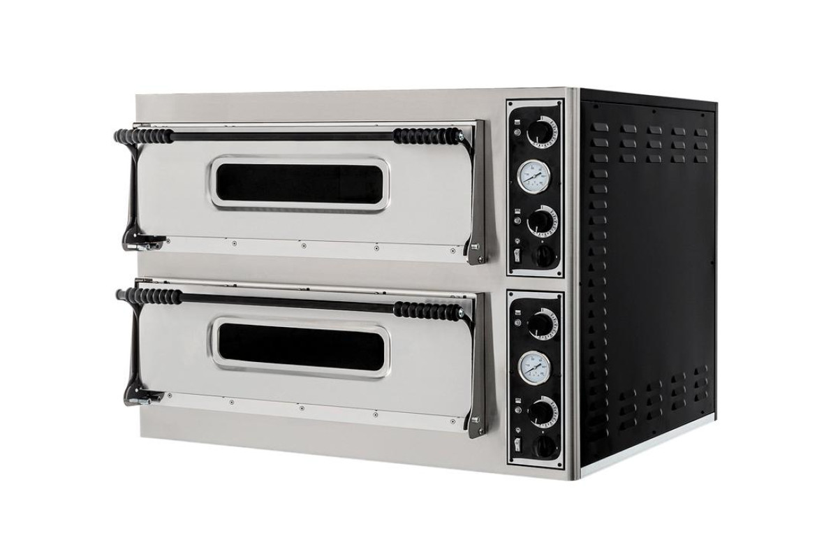 - Двухъярусная конструкция: Два независимых уровня приготовления позволяют одновременно выпекать до 8 пицц диаметром 32 см, что значительно увеличивает производительность.