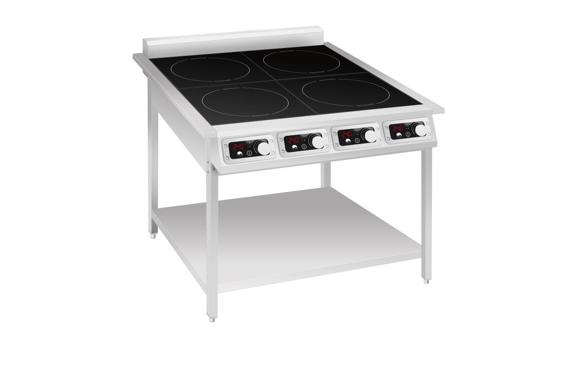 Конструкция плиты представляет собой единый блок из нержавеющей стали, установленный на металлическую подставку. Каждая конфорка оснащена собственной системой управления. Наличие четырех вентиляторов обеспечивает принудительное охлаждение силовых элементов, что повышает надежность и срок службы оборудования при интенсивной эксплуатации. Усиленная конструкция рассчитана на значительную нагрузку — до 20 кг на каждую конфорку.