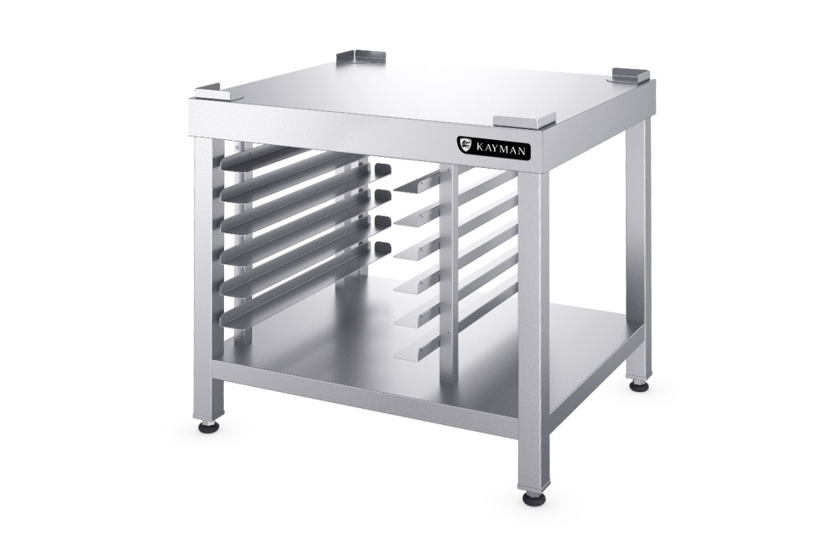 Габариты 700х600х700мм, вместимость GN-1/1 6шт., вместимость противней 600х400мм 6шт., материал столешницы, полки и направляющих AISI 304, материал стоек AISI 210. Разборная конструкция. Сплошная столешница позволяет установить любое технологическое оборудование. Стойки выполнены из трубы квадратного сечения 40х40 мм. В нижней части подставки имеется сплошная полка. Углы столешницы заварены и зачищены для обеспечения простоты санитарной обработки и уборки. В верхней части столешницы по углам установлены упоры, предотвращающие случайное падение оборудования во время его эксплуатации. На стойках расположены направляющие для установки гастроемкостей GN 1/1 и/или пекарских противней размером 600х400 мм. Опорные ножки подставки регулируются по высоте для компенсации неровностей пола. Вес 37кг.