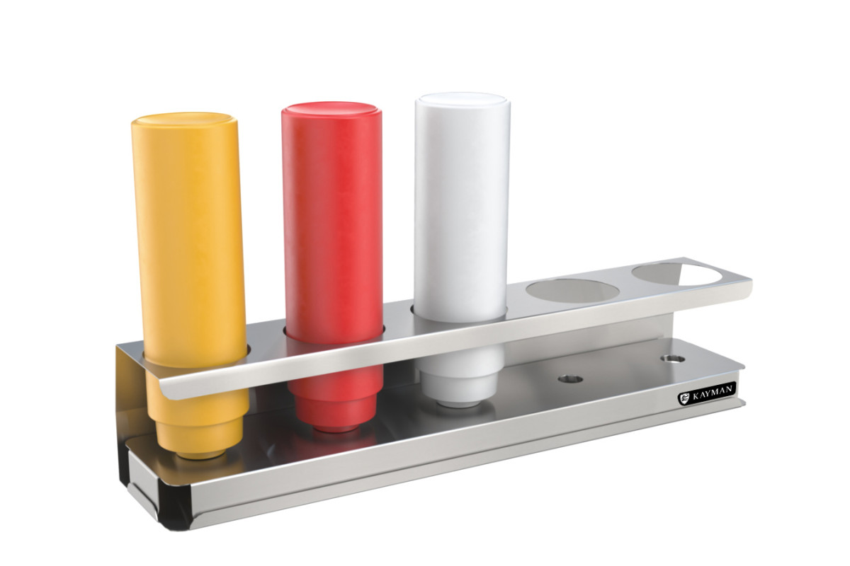 Габариты 489х102х101мм. На 5 бутылок с соусами диаметром не более 69мм, материал нержавеющая сталь AISI430. Представляет собой подставку для соусов и вставку для размещения соусов вниз горловиной. Подставка предназначена для демонстрации и хранения соусов. Масса 1,2кг.