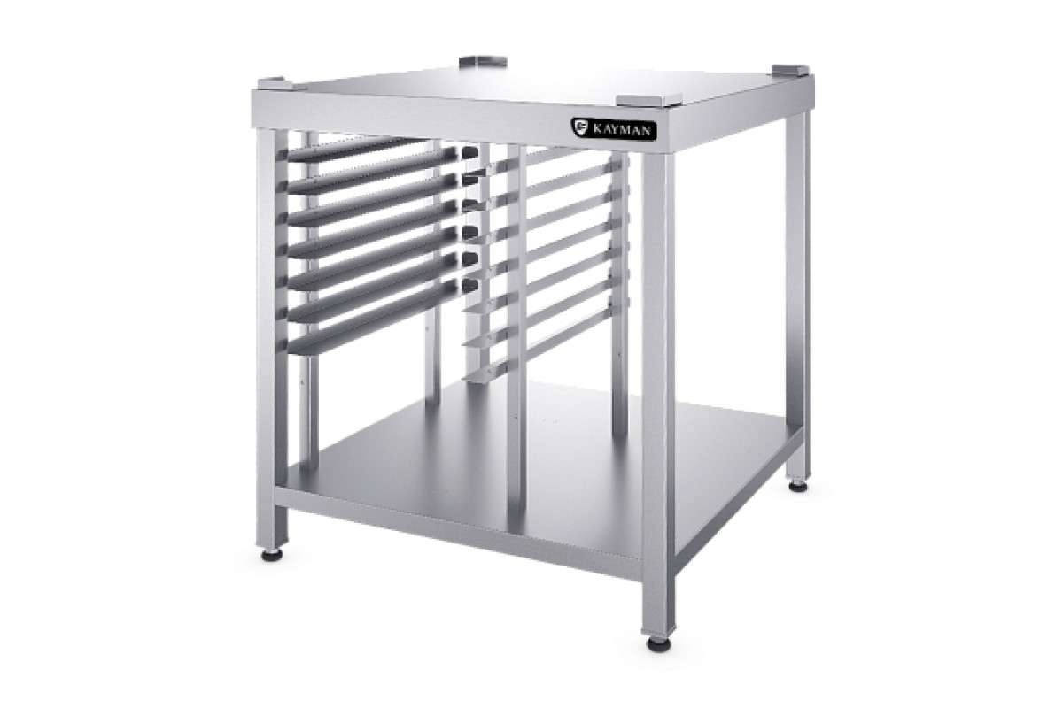 Габариты 800х800х960мм, вместимость GN-1/1 7шт., вместимость противней 600х400мм 7шт., подходит для ПАРОКОНВЕКТОМАТ ЭЛЕКТРИЧЕСКИЙ KAYMAN, материал столешницы, полки и направляющих AISI 304, материал стоек AISI 210. Разборная конструкция. Сплошная столешница позволяет установить любое технологическое оборудование. Стойки выполнены из трубы квадратного сечения 40х40 мм. В нижней части подставки имеется сплошная полка. Углы столешницы заварены и зачищены для обеспечения простоты санитарной обработки и уборки. В верхней части столешницы по углам установлены упоры, предотвращающие случайное падение оборудования во время его эксплуатации. На стойках расположены направляющие для установки гастроемкостей GN 1/1 и/или пекарских противней размером 600х400 мм. Опорные ножки подставки регулируются по высоте для компенсации неровностей пола. Вес 50кг.