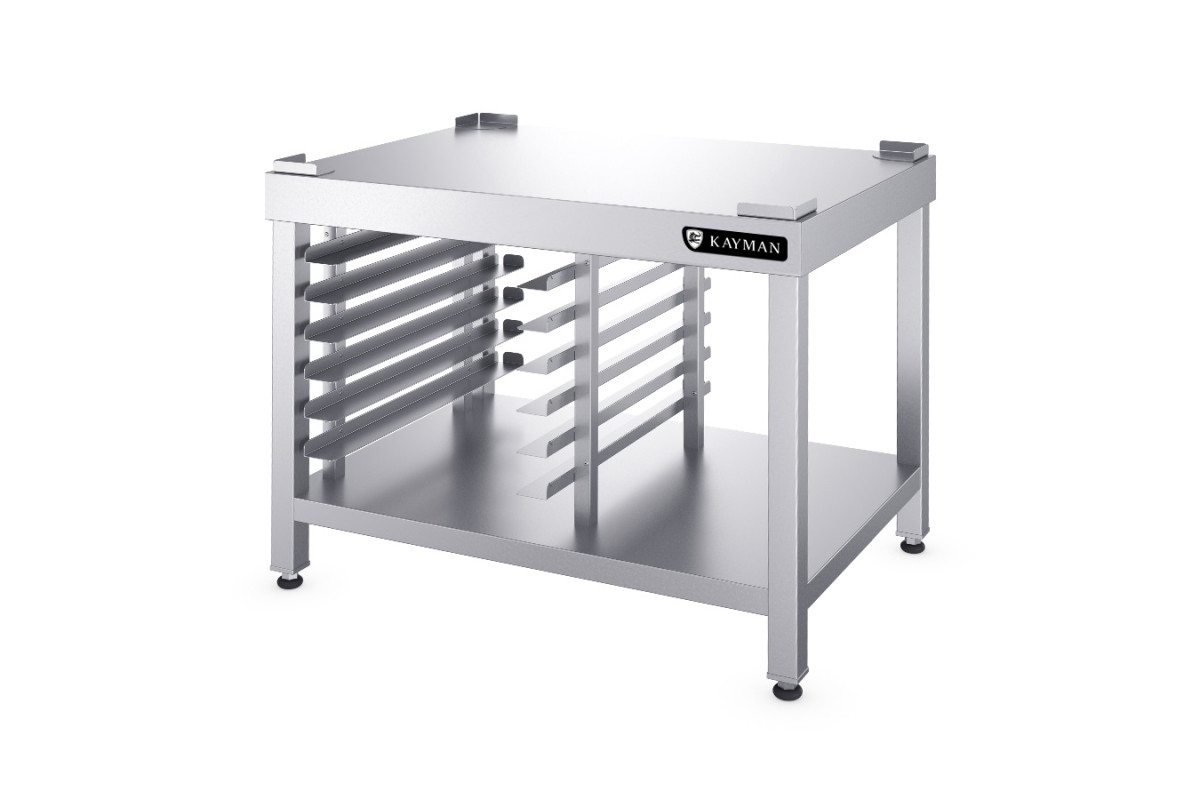 Габариты 900х800х700мм, вместимость GN-1/1 6шт., вместимость противней 600х400мм 6шт.,материал столешницы, полки и направляющих AISI 304, материал стоек AISI 210. Разборная конструкция. Сплошная столешница позволяет установить любое технологическое оборудование. Стойки выполнены из трубы квадратного сечения 40х40 мм. В нижней части подставки имеется сплошная полка. Углы столешницы заварены и зачищены для обеспечения простоты санитарной обработки и уборки. В верхней части столешницы по углам установлены упоры, предотвращающие случайное падение оборудования во время его эксплуатации. На стойках расположены направляющие для установки гастроемкостей GN 1/1 и/или пекарских противней размером 600х400 мм. Опорные ножки подставки регулируются по высоте для компенсации неровностей пола. Вес 49,5кг.