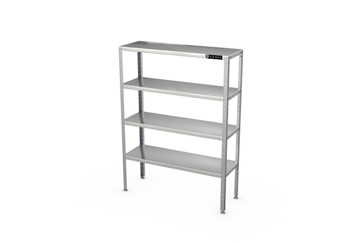 600х600х1800мм, нагрузка на полку 22кг. Материал полок AISI 430 0,8мм, материал стоек AISI 430 1,2мм, профиль стоек 1,2мм уголок 40х40мм. Регулировка ножек 20мм. Шаг размещения полок 50мм. Вес 26кг. Все кромки полок и элементов стоек имеют подгиб (фальцовку). Под полкой размещен дополнительный швеллер-усилитель. Опорные ножки имеют пластиковое основание. Изделия разборные и поставляются в удобной упаковке.