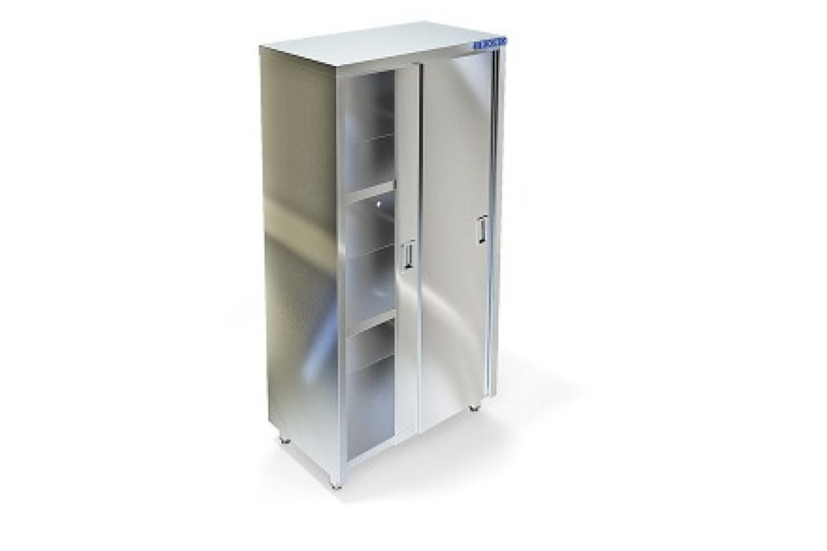 1200х500х1750мм, Стеллаж закрытый из нержавеющей стали марки AISI 430 толщиной 0,8 мм. Задняя стенка из нержавеющей стали марки AISI 430 толщиной 0,8мм. Две двери-купе, внутри три полки из нержавеющей стали марки AISI 430 толщиной 0,8мм. Регулируемые опоры. Поставляется в собранном виде.