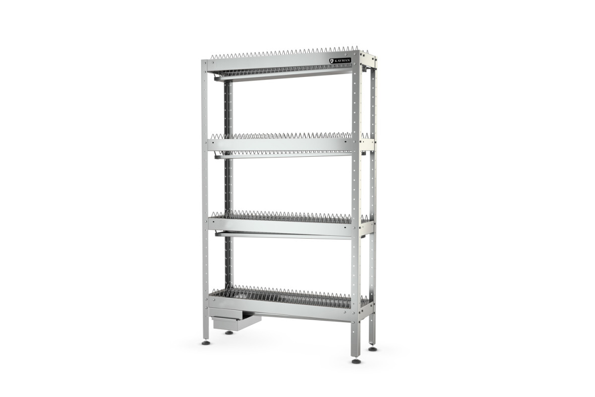 1500х300х1670мм, тарелок 224шт., материал полки AISI430 0,8мм, материал кассеты для тарелок AISI 304, толщина прутка 3мм, материал стоек AISI430 1,2мм, стойки 1,2мм уголок 40х40мм. Ножки, регулируемые по высоте 20мм. Вес 36,7мм.