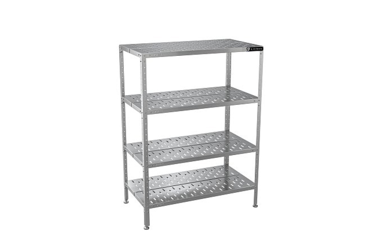 950х650х1600мм, нагрузка на полку 36кг. Материал полок AISI 430 0,8мм, сдвоенные, перфорированные. Материал стоек нерж. сталь AISI 430 1,2мм, профиль стоек уголок 40х40мм. Регулировка ножек 20мм. Шаг размещения полок 50мм. Вес 31,6кг. Все кромки полок и элементов стоек имеют подгиб (фальцовку). Стеллаж состоит их четырех сдвоенных перфорированных полок и четырех стоек. Полки могут устанавливаться на разных уровнях. Ножки имеют пластиковую опорную часть и регулируются по высоте. Изделия разборные и поставляются в удобной упаковке.
