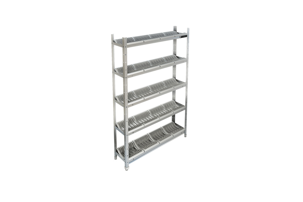 1200х300х1830, разборный, стойки из оцинкованного уголка, 5 полок из стали AISI 430 c кассетами из пластмассы на 250 тар. Поддон из стали AISI 304
