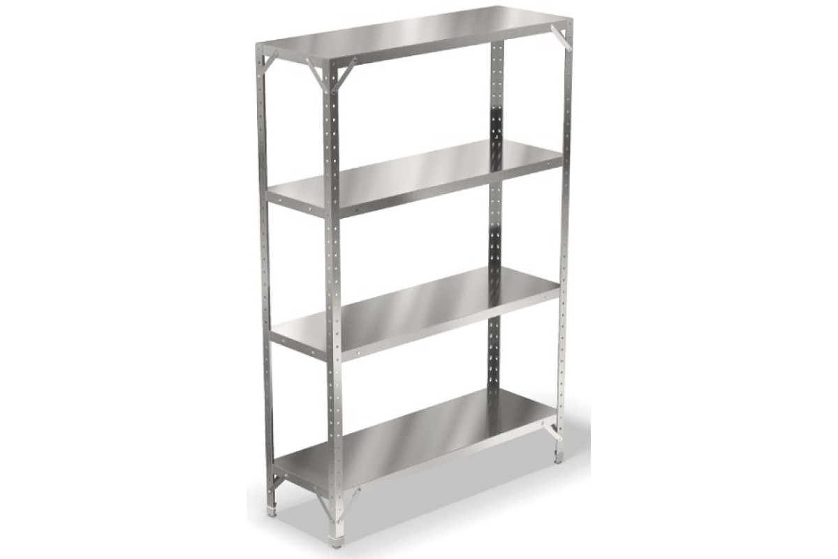 1500х600х1800мм, Стеллаж, 4 сплошные полки из нержавеющей стали AISI 430 толщиной 0,5 мм с усилителем. Расстояние между полками регулируемое с шагом 50мм.. Каркас из уголка нержавеющей стали AISI 430 толщиной 1,5 мм. Распределенная статическая нагрузка на полку - 50 кг. Наличие подгибов по периметру полки исключает опасность травм.