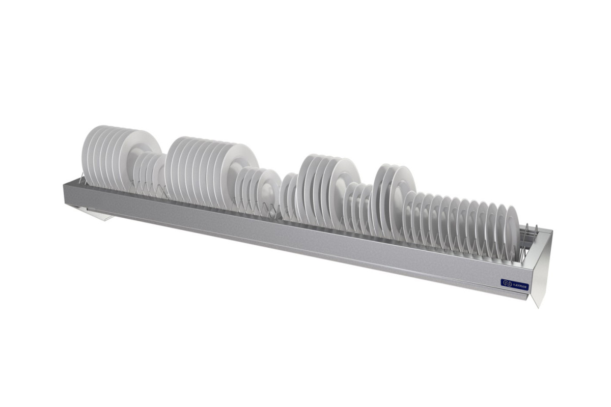 Габариты 1500х300х225мм, каркас AISI 430 0,8мм, в каркас установлена кассета для 56 тарелок, изготовленная из нержавеющего прутка AISI 304 3мм. Кассеты съемные. Состоит из полки, кассеты и сливного лотка. Кассета представляет собой решётку из прутка, в ячейки которой помещаются тарелки. Под полкой установлен сливной лоток для сбора жидкости. В лотке предусмотрен небольшой уклон, обеспечивающий сток жидкости, поступающей с мокрой посуды к сливному отверстию. Все края полки имеют подгиб для предотвращения травматизма персонала при пользовании полкой. В комплект поставки полки входят крепежная планка и метизы для закрепления полки на стене. Максимальная равномерно распределенная нагрузка 25 кг. Вес 9кг.