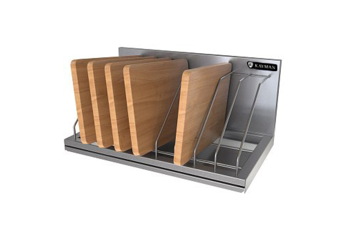 Габариты 600х350х290мм, кол-во секций 9, материал полки AISI 430 0.8мм, материал разделительного прутка AISI 304 3.0мм. Все кромки имеют подгиб, выдвижной поддон под полкой собирает стекающую с досок воду для последующего её удаления. В комплект поставки полки входят крепежная планка и метизы для закрепления полки на стене. Полка может размещаться как на стене, так и на столе. Изделие разборное. Полки кухонные для досок предназначены для размещения в вертикальном положении, хранения и сушки в естественных условиях разделочных досок. Вес 5,5кг.