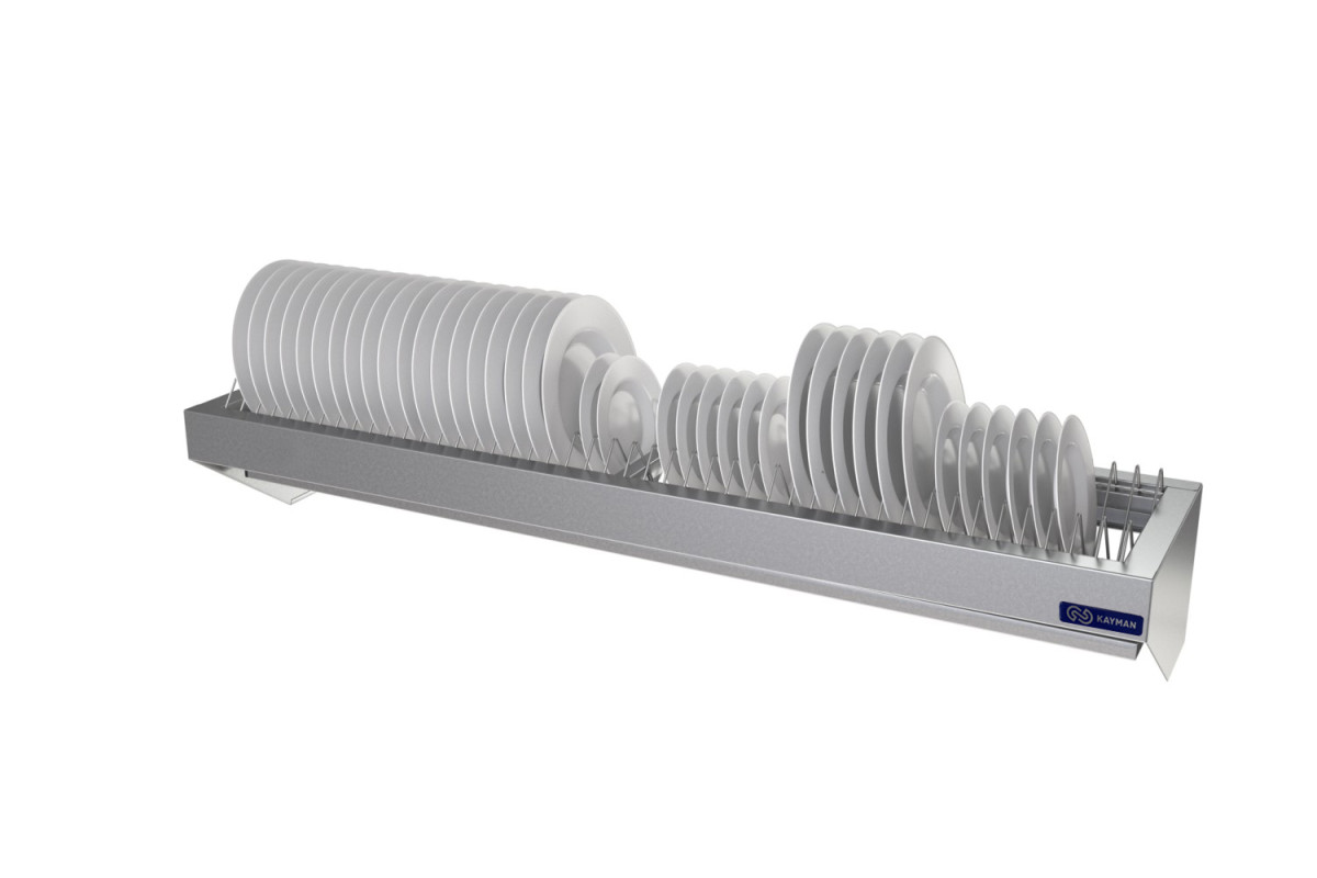 Габариты 1200х300х225мм, каркас AISI 430 0,8мм, в каркас установлена кассета для 44 тарелок, изготовленная из нержавеющего прутка AISI 304 3мм. Кассеты съемные. Состоит из полки, кассеты и сливного лотка. Кассета представляет собой решётку из прутка, в ячейки которой помещаются тарелки. Под полкой установлен сливной лоток для сбора жидкости. В лотке предусмотрен небольшой уклон, обеспечивающий сток жидкости, поступающей с мокрой посуды к сливному отверстию. Все края полки имеют подгиб для предотвращения травматизма персонала при пользовании полкой. В комплект поставки полки входят крепежная планка и метизы для закрепления полки на стене. Вес 7,2кг.