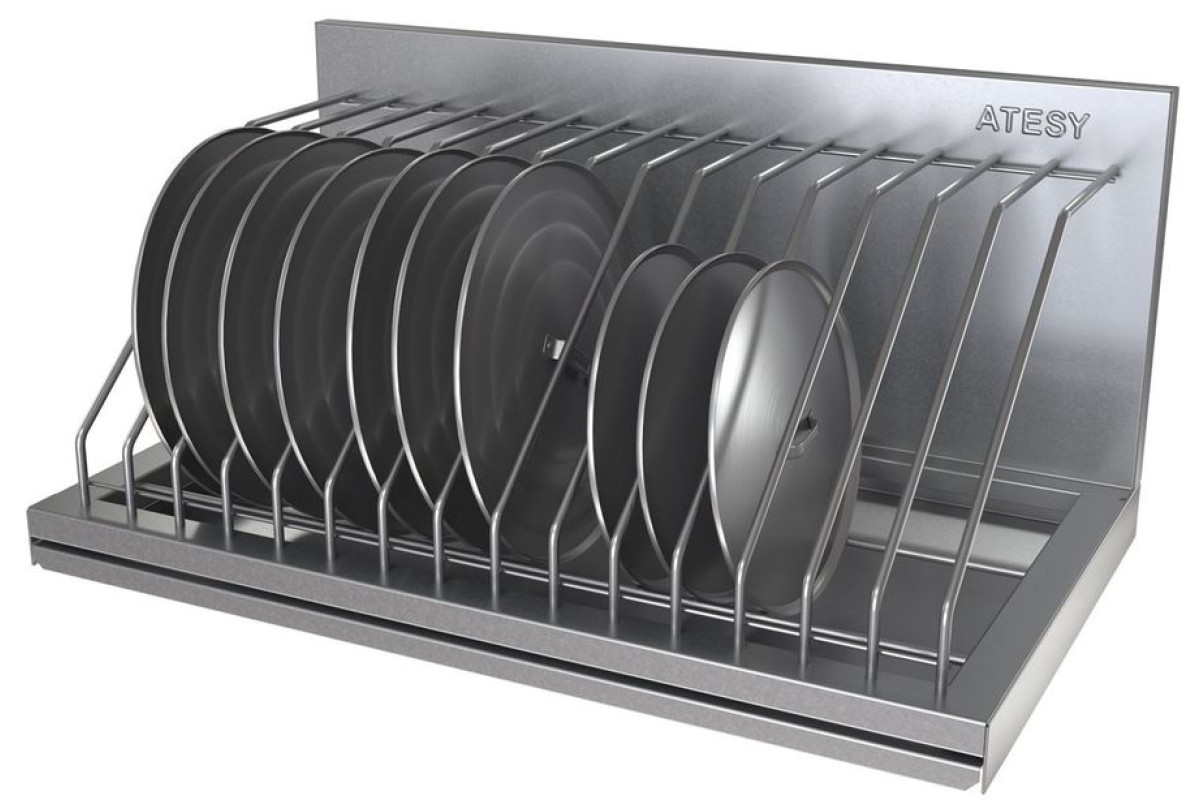 - Полка имеет 15 отделений, выполненных из нержавеющего прутка (сталь AISI 304), для размещения крышек диаметром от 160 до 500 мм.