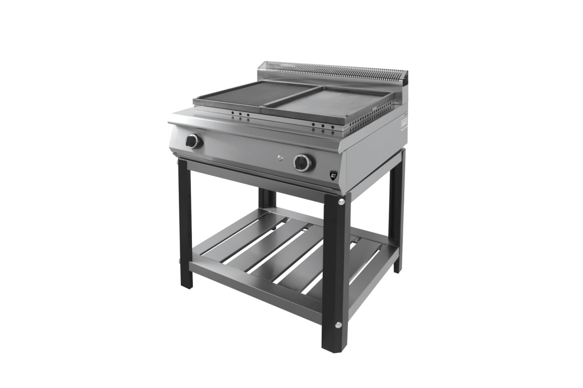 2 специальные горелки с запальной системой розжига, газовая мощность 23 kW, чугунная рабочая поверхность, 1/2 рифленая, 1/2 гладкая, электророзжиг, газ/контроль, г.нетто 800x800x1050, 124кг, г.брутто:950х950х600, 149кг.