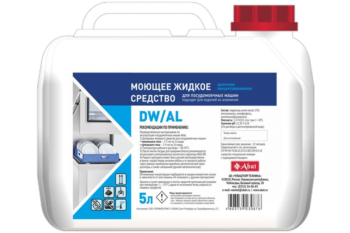 Концентрированное жидкое щелочное моющее средство DW AL предназначено для мытья различных видов посуды в посудомоечных машинах, применяется для мытья алюминиевой посуды и оборотной тары, используется в сочетании с ополаскивателем "Abat DR".