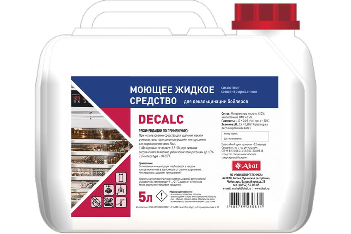 Жидкое кислотное средство Decalc предназначено для очистки нагревательных элементов и внутренних поверхностей бойлеров, удаляет накипь и минеральные налеты, предотвращает образование стойких солевых отложени.