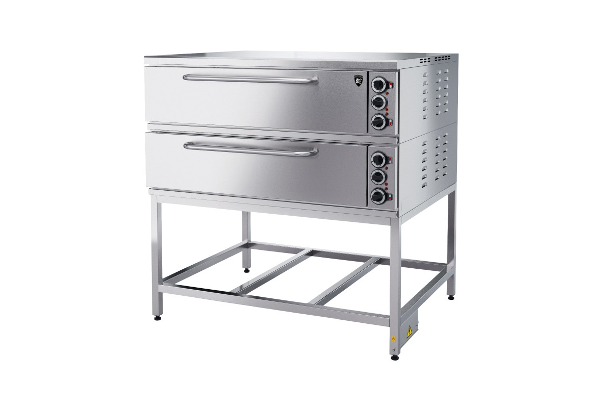 1300х1080х1330мм, 10,4кВт, 400/230В, лицевая часть нерж. сталь, модульная конструкция, две пекарные камеры, внутренний размер камеры 1000*800*180мм,нерж ТЭН-ы, раздельная регулировка верхних и нижних ТЭН-ов (+20…+270 С), под - углеродистая сталь, подставка крашенная, сварная конструкция. Секция и подставка поставляются в отдельных упаковках. Дополнительные опции: противни 470х530х30, нерж.; комплект подового камня, фельзит, 380х495х20мм - 4шт. Упаковка: деревянная обрешетка, поддон.