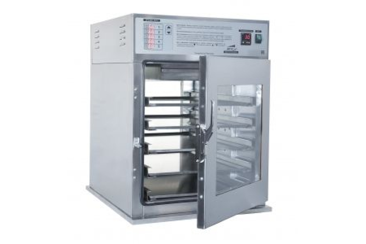 Шкаф тепловой с пароувлажнением сквозного исполнения с электронной панелью управления, 2 распашные дверцы со стеклом предназначен для хранения готовых продуктов. Пять уровней с независимыми таймерами. В комплекте резервуар для воды, для поддержания влажности и направляющие для противней. Шаг установки противней – 95мм. Противни из нерж. стали 5 шт. входят в комплект поставки.