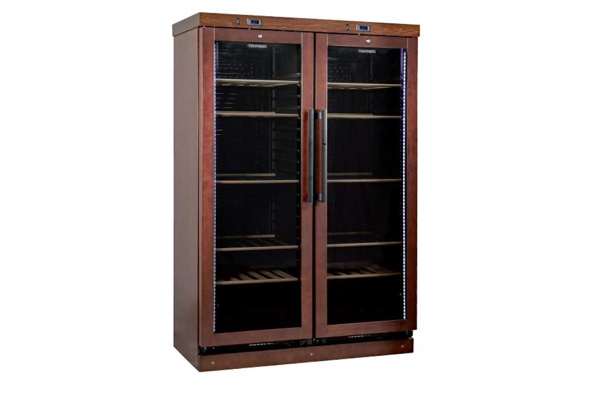 1275x620x1837мм, 0,13кВт, 220B, +3/+16, 690л, 185кг, 10 деревянных полок для вертикальной установки бутылок, 216 бутылок диам.75, с встр.агр. R600A, стекл. двери, темный орех