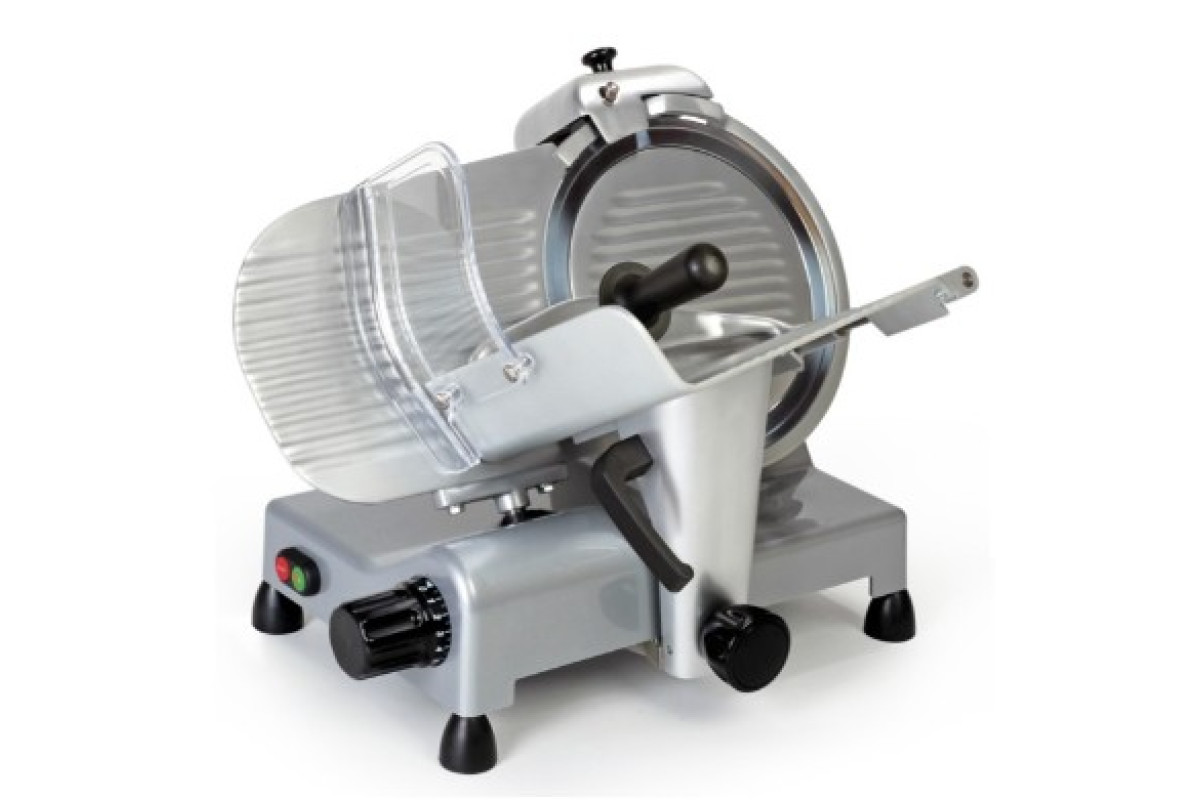 550х480х430 мм. Диаметр ножа 300 мм, рез 200 x 205 мм. Ход каретки 235мм. Профессиональный слайсер для нарезки мяса, сыра, колбасных изделий и других продуктов питания. Толщина нарезки 0-14/16 мм. Слайсер для профессионального использования на предприятиях общественного питания. Нож из хромированной стали, корпус из лакированного алюминия с пластиковыми деталями. Фиксированное заточное устройство. Система Easy Clean - легко откидываемая каретка позволяет очищать слайсер более удобным и быстрым способом. Версия DOM, спец. исполнение с красными ручками