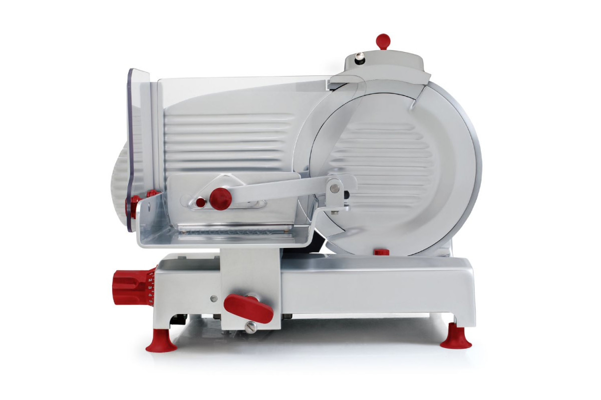 Диаметр ножа 300 мм, Передача редукторная, ручной вертикальный слайсер для нарезки мясных деликатесов. Толщина нарезки 0-25 мм. Слайсер для профессионального использования на закрытых кухнях ресторанов. Детали из алюминия и нержавеющей стали, корпус из анодированного алюминия с пластиковыми деталями. Встроенное заточное устройство. Специальная конструкция для легкости очистки и точной нарезки.