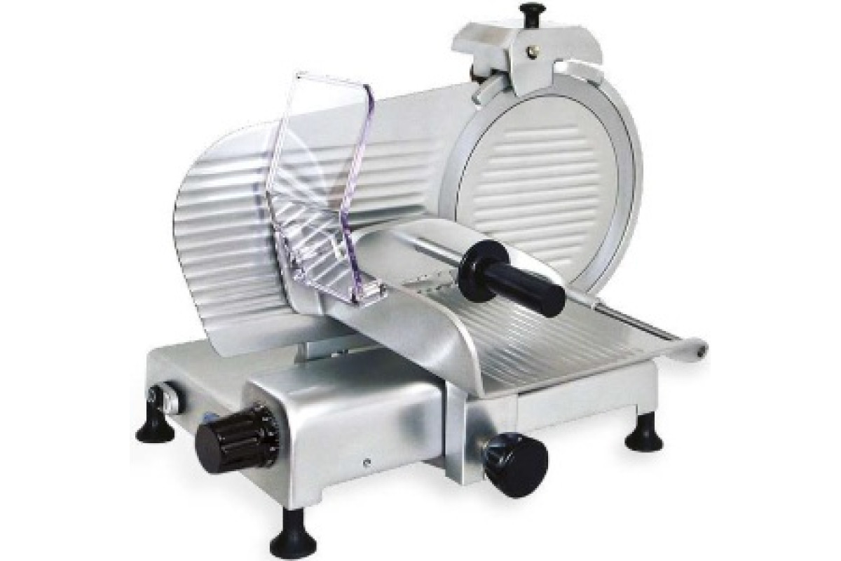 Габариты 683 x 552 x H 560 мм. Диаметр ножа 350 мм, рез 265 x 225 мм. Полуавтоматический вертикальный слайсер для нарезки мяса, сыра, колбасных изделий и других продуктов питания. Толщина нарезки 0-15 мм. Слайсер для профессионального использования на предприятиях общественного питания. Нож из хромированной стали, корпус из лакированного алюминия с пластиковыми деталями. Фиксированное заточное устройство.
