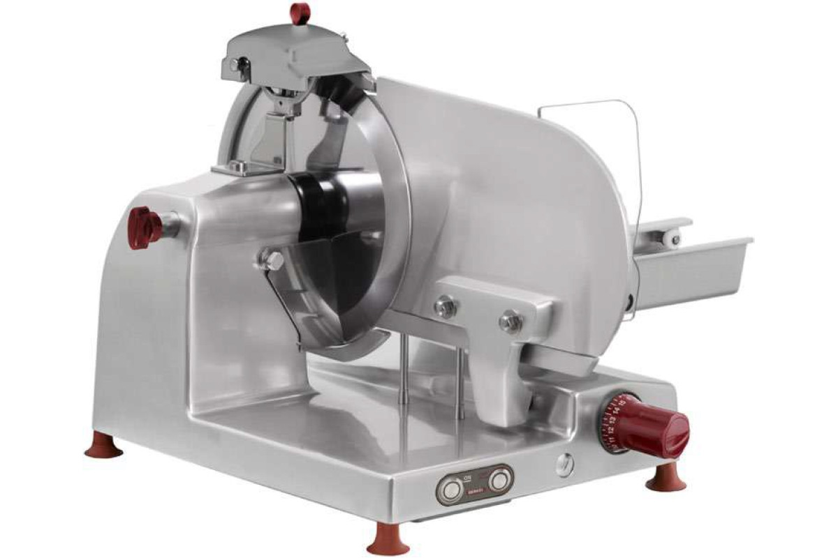 Диаметр ножа 350 мм, Передача редукторная, ручной вертикальный слайсер для нарезки мяса. Толщина нарезки 0-25 мм. Слайсер для профессионального использования на закрытых кухнях ресторанов. Детали из алюминия и нержавеющей стали, корпус из анодированного алюминия с пластиковыми деталями. Встроенное заточное устройство. Специальная конструкция для легкости очистки и точной нарезки.
