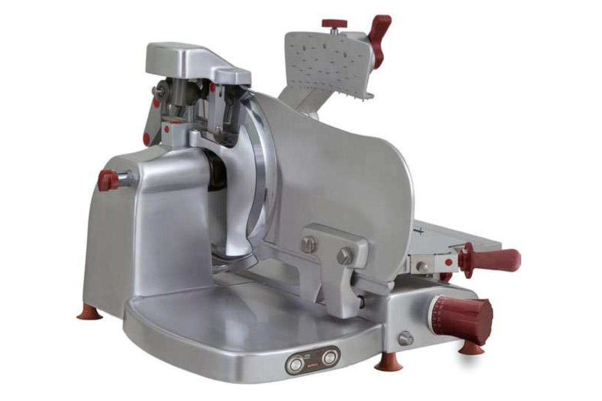 Диаметр ножа 315 мм, Передача редукторная, ручной, толщина нарезки 0-14 мм. Рез 290 х 225 мм. Вертикальный слайсер для нарезки коблас. Компактный слайсер для профессионального использования для интенсивной работы в супермаркетах и на небольших производствах. Детали из алюминия и нержавеющей стали, корпус выполнен из анодированного алюминия, ручки выполнены из пластика. Специальная форма корпуса позволяет жидкости и грязи собираться в одном месте, что облегчает очистку. Встроенное заточное устройство.