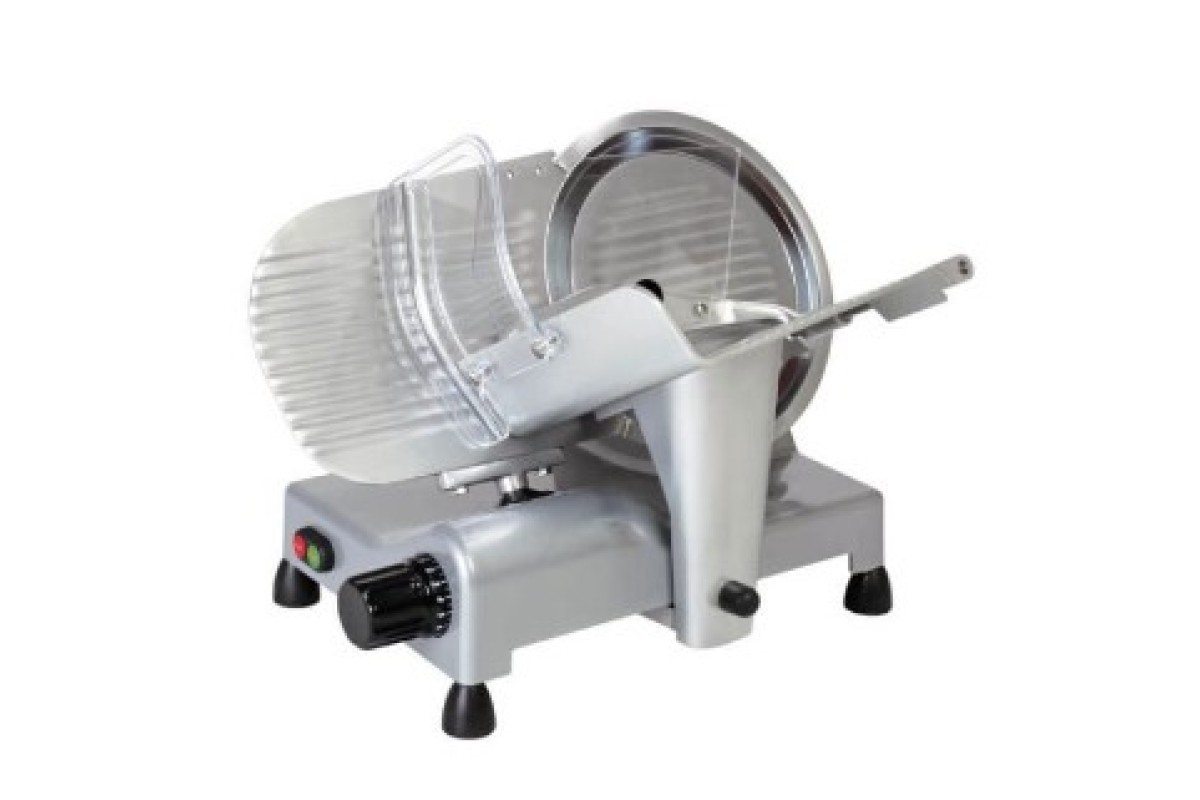 Габариты 605 x 480 x H 420 мм. Диаметр ножа 300 мм, рез 245x195 мм. Полуавтоматический слайсер для нарезки мяса, сыра, колбасных изделий и других продуктов питания. Толщина нарезки 0-14?16 мм. Слайсер для профессионального использования на предприятиях общественного питания. Нож из хромированной стали, корпус из лакированного алюминия с пластиковыми деталями. Съемное заточное устройство.