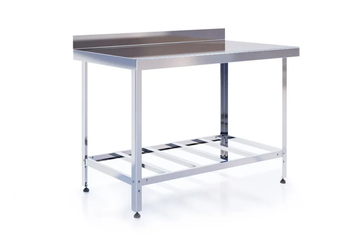 Стол разделочный EKSI СРПЦ Э (L=1000, S=600, H=850-870, РП) Стол разделочный СРПЦ Э выполнен из нержавеющей стали AISI 430, толщина столешницы - 0,8 мм, разборная конструкция, решетчатая полка, каркас - оцин. уголок 40*40*1,5 мм, Hстолешницы -40 мм, Hборта - 40 мм, столешница усилена ЛДСП толщиной 16 мм, регулируемые ножки(+/-20мм), отступ ножек от края столешницы по стороне борта 60 мм