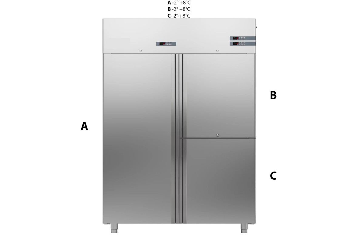 1480х815х2085 мм, 230 кг, 0,66 кВт, 220 В, 1400 литров, от -2 до +8С, нерж сталь AISI 304, толщина изоляции 75 мм, подсветка, замок, 3 глухие двери, R452а, в комплекте: 7 полок GN2/1, 7 пар направляющих, с агрегатом