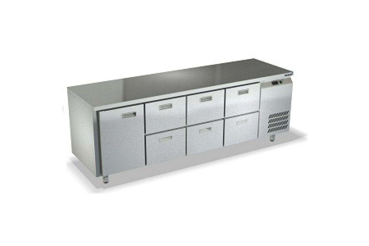 2280х600х850мм, Охлаждаемый стол без борта, боковое расположение агрегата. Столешница и корпус из нержавеющей стали марки AISI 430. Задняя панель и дно из оцинкованной стали. 1 дверь, 6 ящиков гастронормированных нагрузка по 35кг на ящик, направляющие с доводчиками (Австрия). Температурный режим -2...+10, напряжение 220В, мощность 480Вт, внутренний объем стола 550л, полезный объем стола 276л. Компрессор (Испания). Хладон R-134. Петля доводчик (Польша). Полка решетка регулируемая по высоте с шагом - 45мм, гастронормированная, нагрузка 35кг. Нога опорная круглая, регулировка 50мм (Италия). Поставляется в собранном виде.