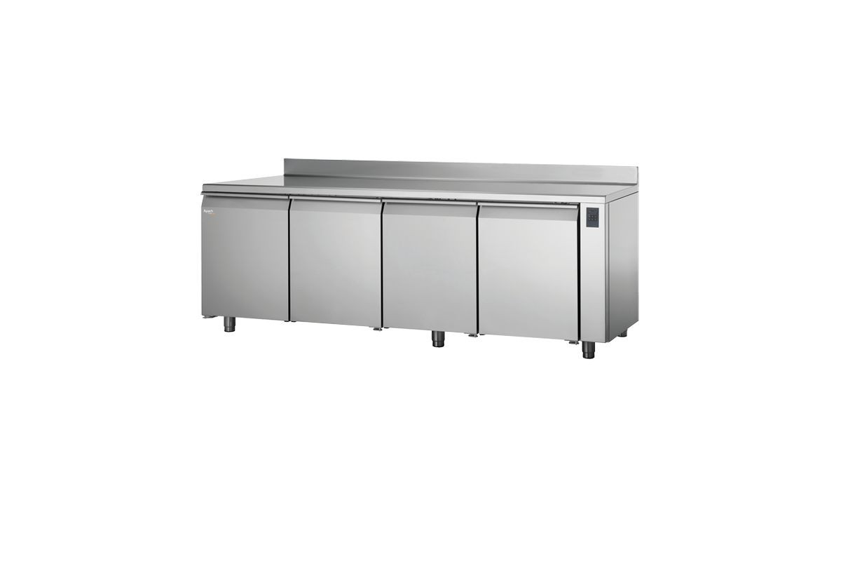 2350х800х950 мм, 195 кг, 0,81 кВт, 220 В, от -2 до +8С, энергосбережение, нерж сталь AISI 304, толщина изоляции 60 мм, со столешницей и бортом, 4 глухие двери, R452а, в комплекте: 16 пар направляющих EN600x400 мм, без агрегата