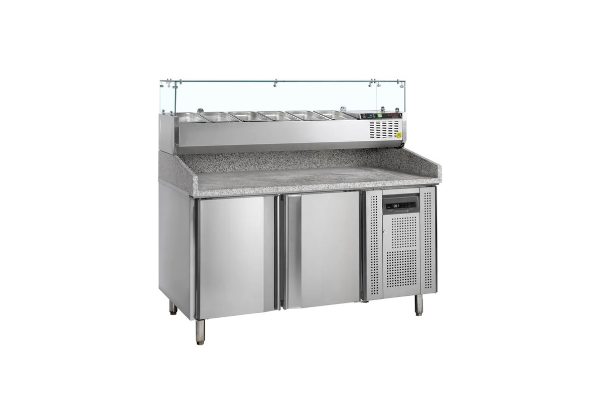 1510x800x1448мм, 0,3кВт, 220В, 6 GN1/3, t=+2/+10С, брутто/нетто - 390/370л, 274кг, с встр. агр., R600a, нерж.сталь, направляющие под 7 противней для пиццы в каждом отсеке (400x600мм), гранитная столешница, вент. охлаждение, автооттайка, 2 самозакрывающиеся двери, регулируемые ножки, в поставке=2 места (стол PT1200+ витрина GVC38-150). Гастроемкости в комплект не входят!