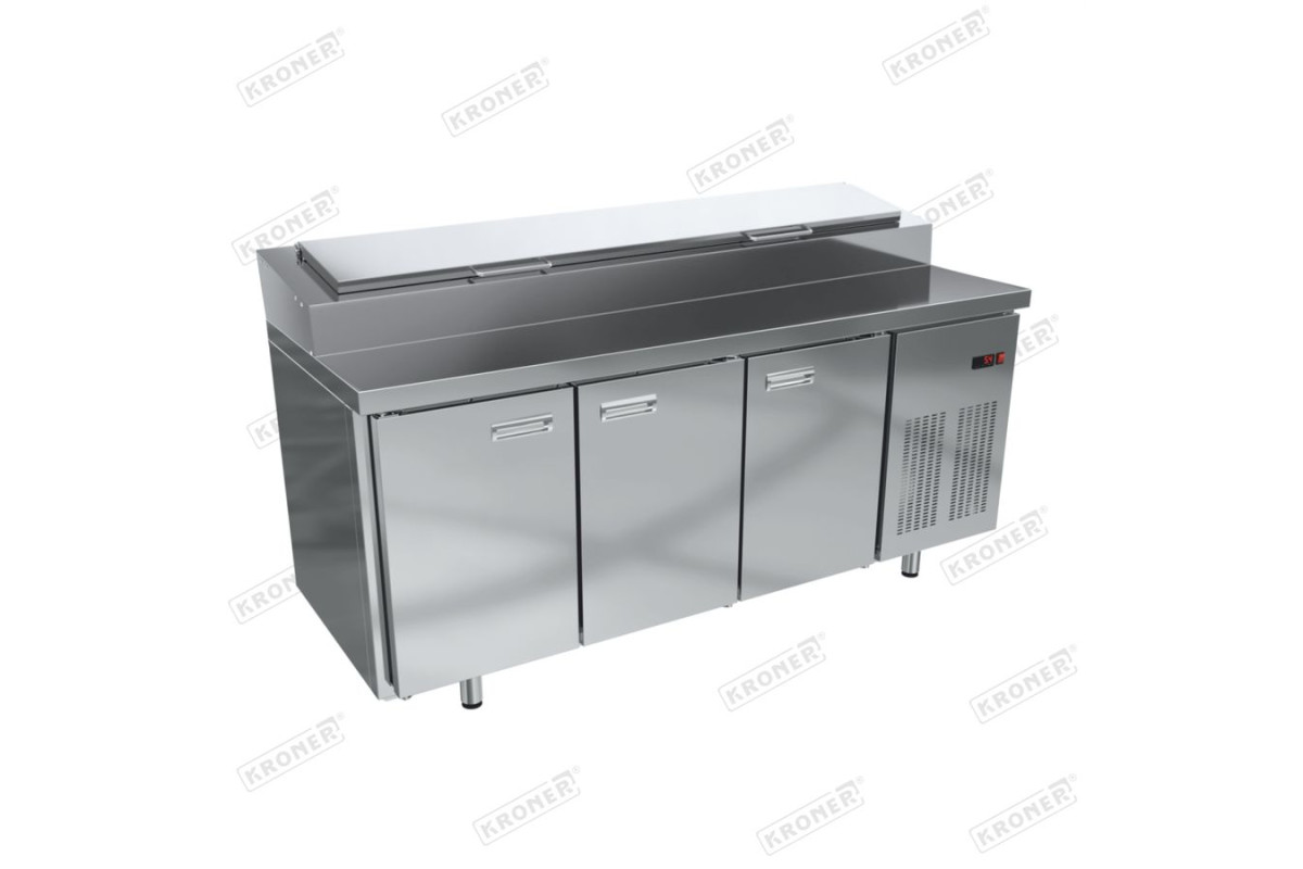Стол холодильный для пиццы используется на предприятиях общественного питания и торговли для раскатки теста и обработки ингредиентов, используемых для приготовления пиццы, салатов и других блюд, а также для охлаждения и хранения продуктов и напитков. Благодаря размщению гастроемкостей на подиуме, все охлажденные ингридиенты находятся у повара под рукой. Цельнозаливные корпус, столешница и двери изготовлены из шлифованной нержавеющей стали и обеспечивают механическую прочность, отличную термоизоляцию и продолжительный срок эксплуатации изделия (долговечность).