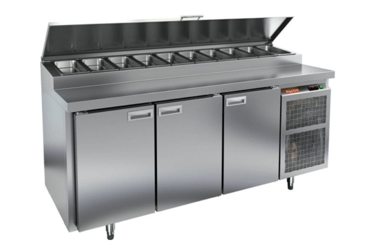 Стол холодильный для пиццы HICOLD PZ2-111/GN (1/6H), из нержавеющей стали марки AISI 304, в верхней части устанавливаются гастроемкости 1/6GN, глубиной 100 мм max, глубина рабочей части столешницы 486мм, 3 распашные двери, гастроемкости в комплект не входят.
