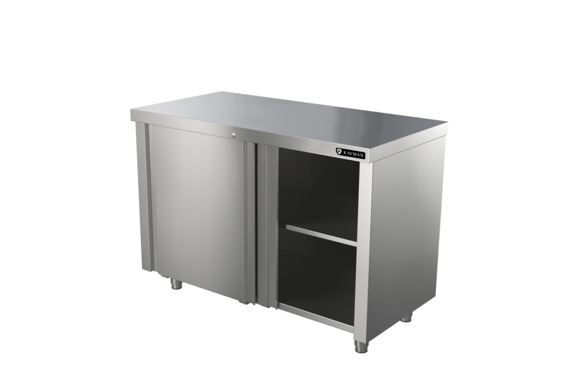 1000х700х870мм, без борта. Столешница нерж. сталь AISI430, 0,8мм. Подложка ДСП 16мм. Максимальная нагрузка на столешницу 107кг, максимальная нагрузка на полку 85кг. 2 двери купе. 1 полка. Вес 56,7кг. Все элементы стола, кроме дна и задней стенки, изготовлены из нержавеющей стали AISI 430 толщиной 0,8 мм. Дно и задняя стенка выполнены из оцинкованной стали. В комплект стола входит полка, усиленная ребром жесткости. Ножки стола изготовлены из нержавеющей стали, имеют пластиковую опорную часть и регулируют высоту стола в пределах 20 мм.