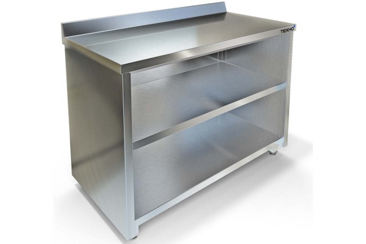 1100х800х850мм, Стол-тумба без дверей с бортом высотой 70мм. Столешница из нержавеющей стали марки AISI 430 толщиной 0,8мм, ЛДСП толщиной 32 мм. Корпус и полка из нержавеющей стали марки AISI 430 толщиной 0,8мм. Задняя стенка из оцинкованной стали толщиной 0,55мм. Регулируемые опоры. Стол поставляется в собранном виде.