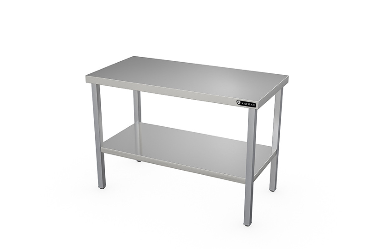 950х800х870мм, нагрузка на столешницу 114кг, без борта, столешница нерж. сталь AISI430 0,8мм, подложка столешницы ДСП 16мм. Ножки нержавеющая сталь AISI 201, зеркальная, толщина металла 1,5мм, квадратная труба 40х40мм. Полка сплошная из нержавеющей стали AISI304. Отсутствие борта позволяет располагать стол в любом месте помещения и осуществлять работу на нем с любой стороны и может быть установлен в центре кухни. Регулируемые ножки 20мм. Вес 31,7кг. Для усиления прочности снизу полки установлен швеллер. Изделие разборное и поставляется в удобной упаковке.