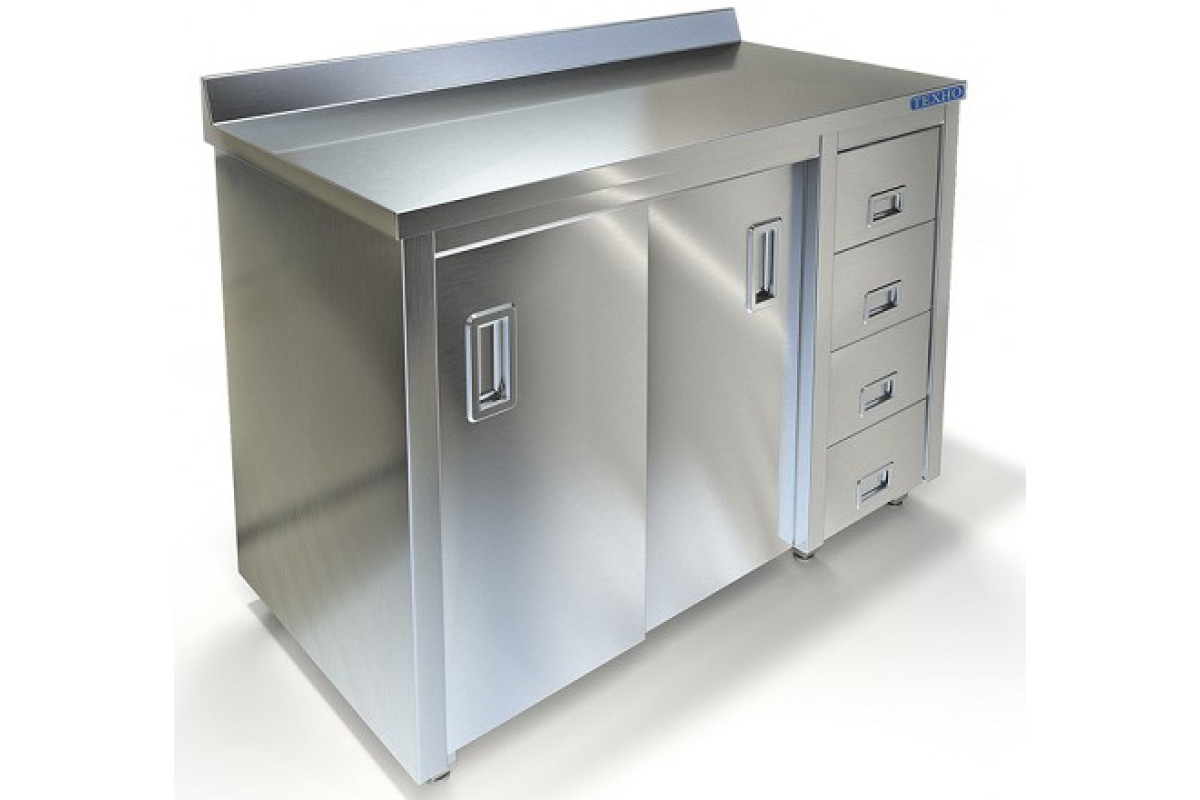1600х700х850мм, Стол-тумба с бортом высотой 70мм. Столешница из нержавеющей стали марки AISI 430 толщиной 0,8мм, ЛДСП толщиной 32 мм. Корпус, две двери-купе и четыре выдвижных ящика расположенных слева изготовлены из нержавеющей стали марки AISI 430 толщиной 0,8мм. Задняя стенка из нержавеющей стали марки AISI 430 толщиной 0,8мм. Регулируемые опоры. Стол поставляется в собранном виде.