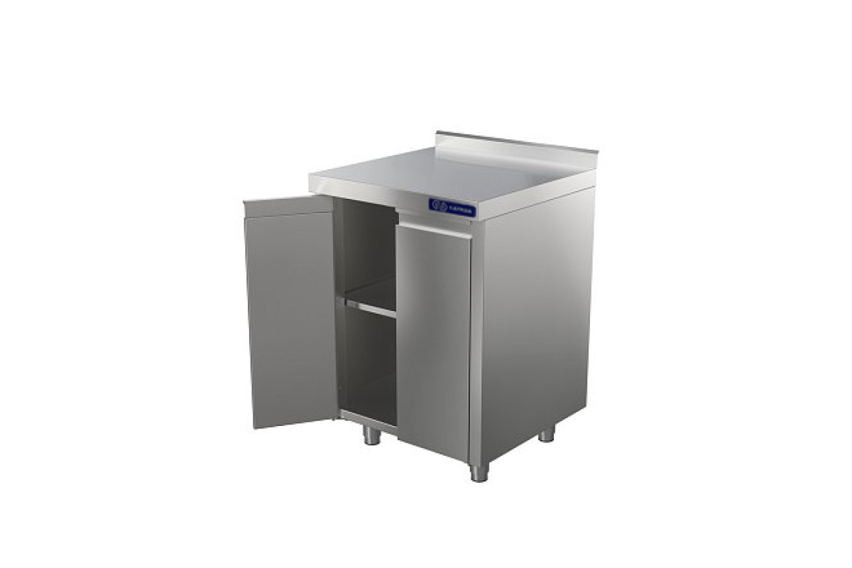 600х700х870мм, 1 борт, нагрузка на столешницу 64кг, нагрузка на полку 48кг. Столешница нерж. сталь AISI430 0,8мм, подложка столешницы ДСП 16мм. 2 распашные двери. Двери, боковые панели и столешница выполнены из нержавеющей стали AISI430. Дно и задняя стенка выполнены из оцинкованной стали. В комплект стола входит полка, усиленная ребром жесткости. Наличие полки позволяет увеличить полезное пространство в столе размещая на ней посуду, инвентарь, столовые приборы и сухие виды продуктов. Регулируемые ножки 20мм. Вес 34кг.