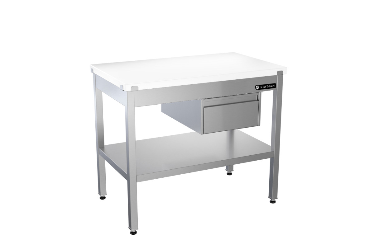 1200х600х850мм, стол с полипропиленовой столешницей, 1-й сплошной полкой и 1-м ящиком 1000х600х850мм, без борта. Максимальная нагрузка на столешницу 108кг. Каркас нержавеющая сталь AISI201 зеркальная, квадратная труба 40х40мм. Полка сплошная из нержавеющей стали AISI304.