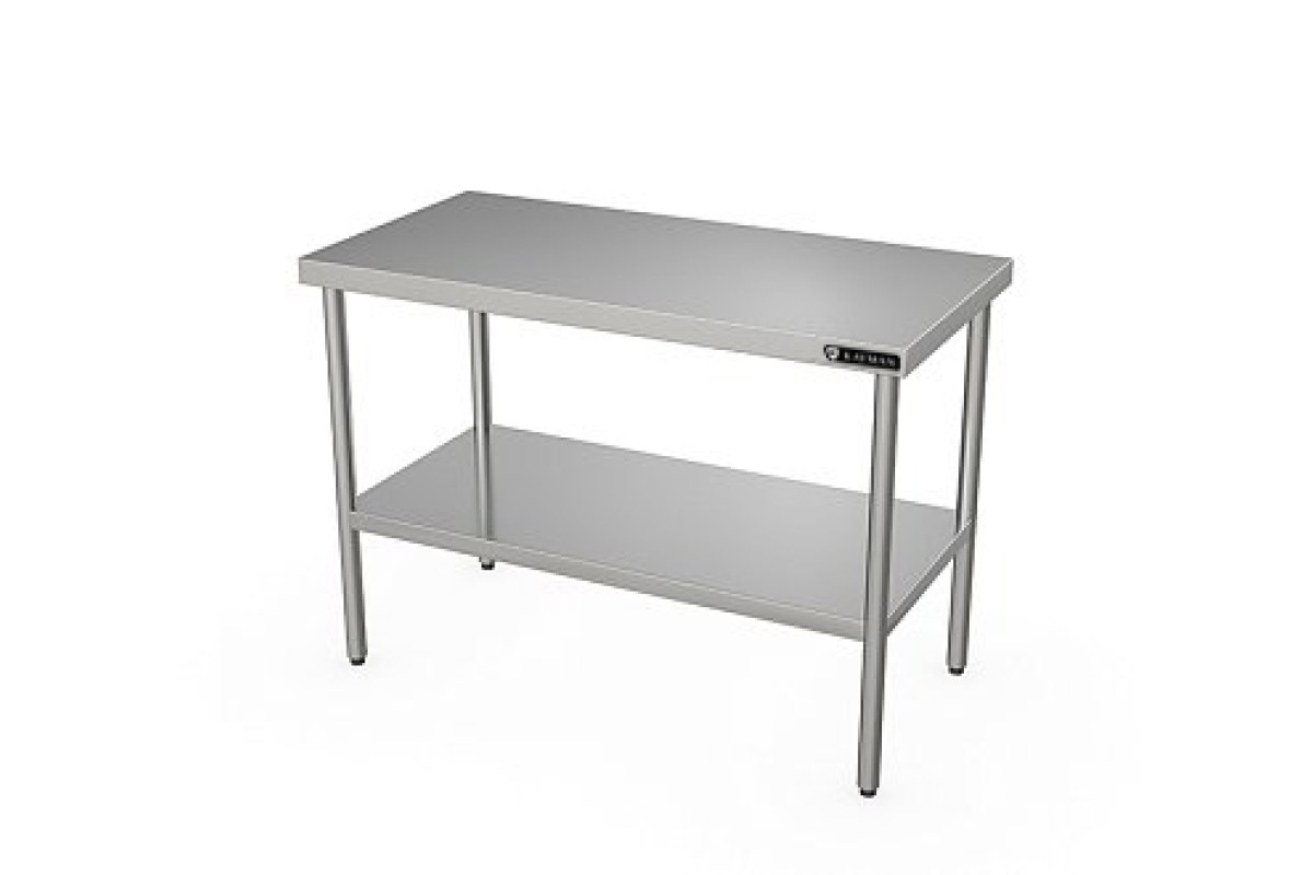 400х700х870мм, нагрузка на столешниц 73.5кг, без борта, столешница нерж. сталь AISI430 0,8мм, подложка столешницы ДСП 16мм. Ножки нержавеющая сталь AISI 201, зеркальная, толщина металла 1,5мм, круглая труба диаметр 40мм. Полка сплошная из нержавеющей стали AISI430. Отсутствие борта позволяет располагать стол в любом месте помещения и осуществлять работу на нем с любой стороны и может быть установлен в центре кухни. Регулируемые ножки 20мм. Вес 12кг. Сплошная полка стола выполнена из нержавеющей стали и крепится к уголкам на каркасе. Для усиления прочности снизу полки установлен швеллер. Изделие разборное и поставляется в удобной упаковке.
