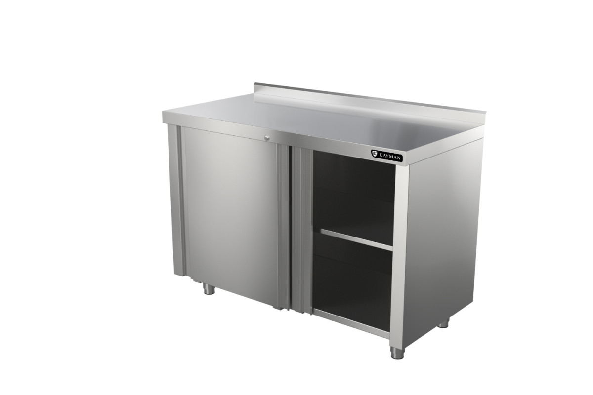 1400х700х870мм, 1 борт, нагрузка на столешницу 150кг, нагрузка на полку 119кг. Столешница нерж. сталь AISI430 0,8мм, подложка столешницы ДСП 16мм. 2 двери купе. Двери, боковые панели и столешница выполнены из нержавеющей стали AISI430. Дно и задняя стенка выполнены из оцинкованной стали. В комплект стола входит полка, усиленная ребром жесткости. Наличие полки позволяет увеличить полезное пространство в столе размещая на ней посуду, инвентарь, столовые приборы и сухие виды продуктов. Регулируемые ножки 20мм. Вес 79,4кг.