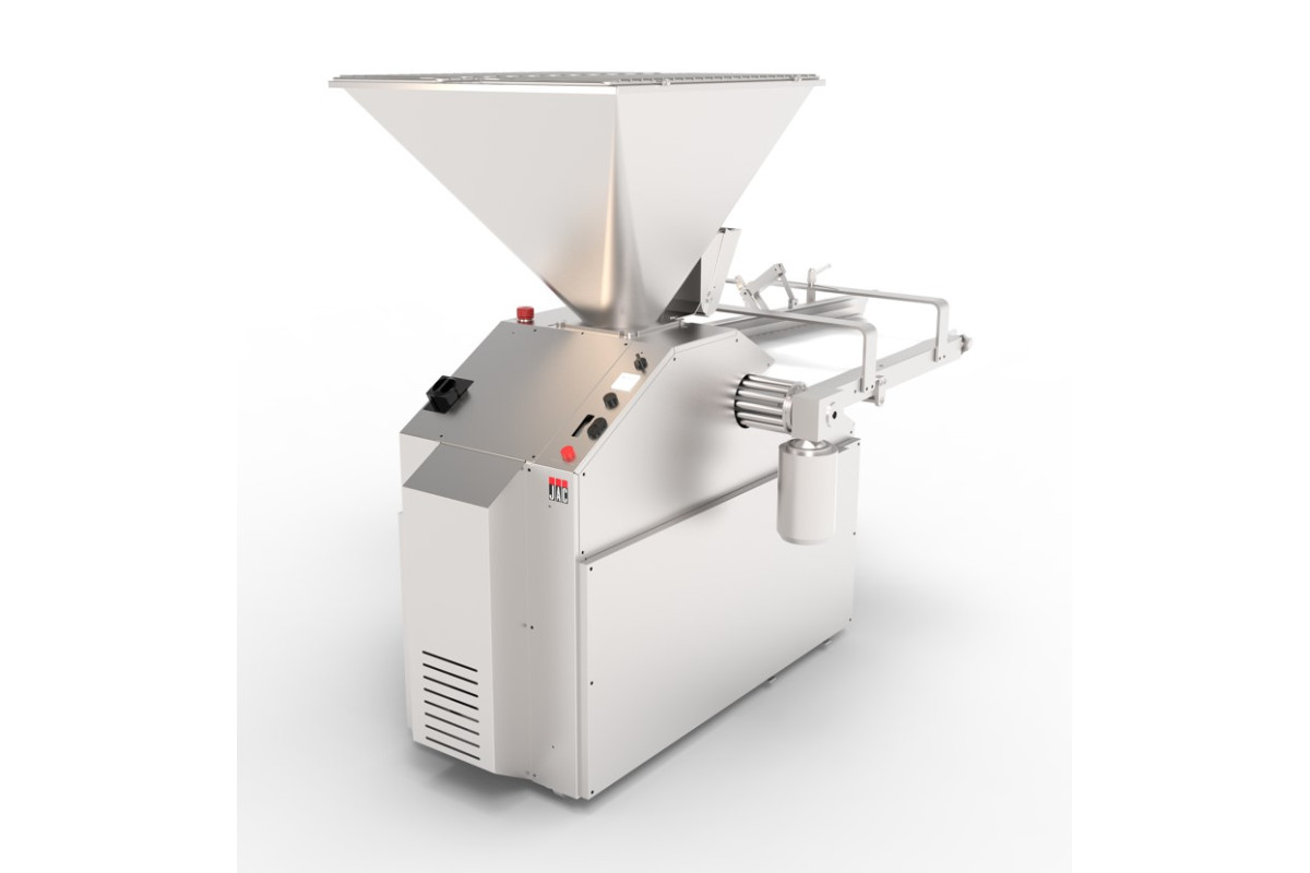 1802х563 (850 ширина бункера)х1701мм, 2,2кВт, 380В, регулируемая скорость, 960-2000 шт/ч, бункер с тефлоновым покрытием на 120кг, поршень 80мм, корпус из нерж. стали