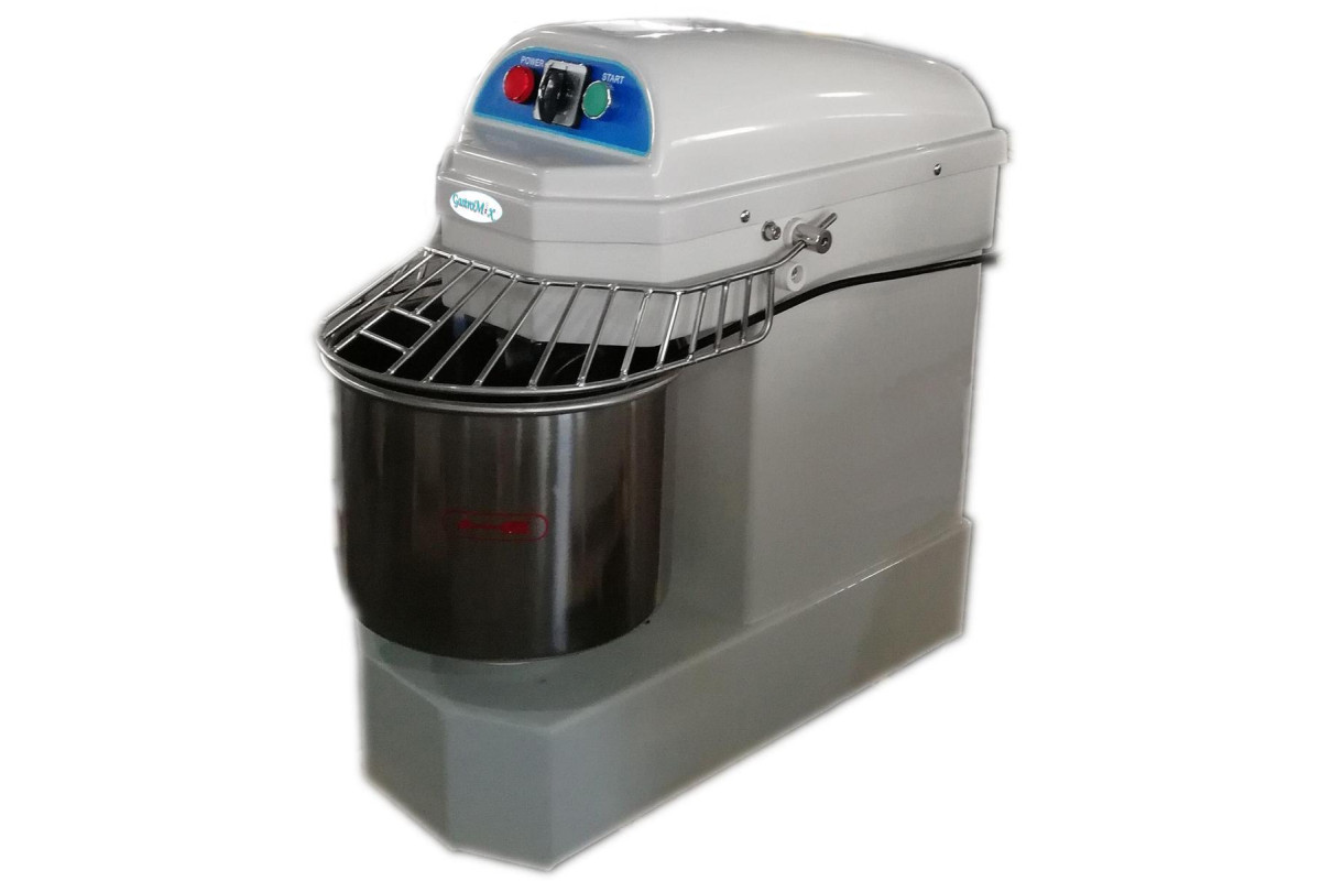 Модель оснащена неподъемной траверсой и несъемной дежей. Конструкция включает прочный корпус из крашеной стали и внутренние элементы из нержавеющей стали для соответствия санитарным нормам. Сочетание вращения спирали и медленного вращения дежи обеспечивает интенсивный и равномерный замес.