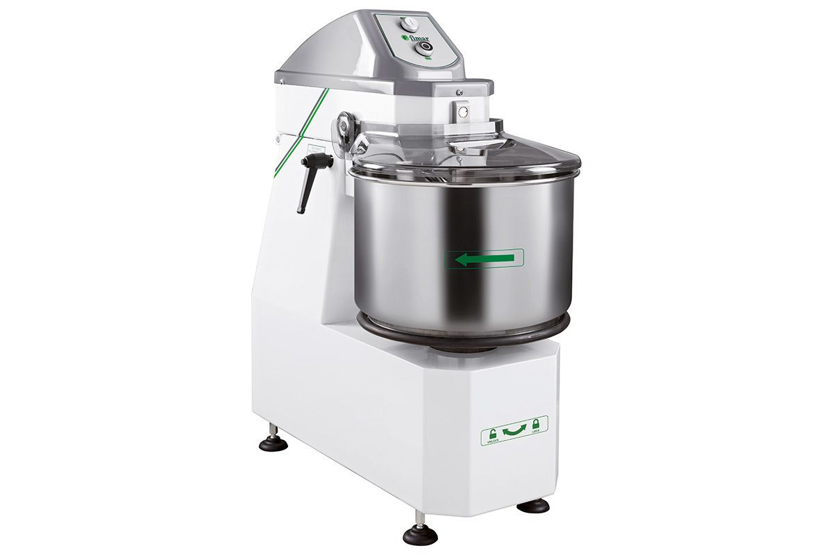 Cпиральный тестомес предназначен для замеса различных типов теста, наилучшим образом подходит для приготовления мягкого теста, например, для хлеба, пиццы и тонких лепешек. Со съёмной вращающейся дежой, производительность 36 кг/ч, объем дежи 16 л, загрузка теста 12 кг. Модель оснащена предохранительным микровыключателем на крышке дежи и подъемной головкой с месильным органом. Корпус покрыт стойкой к механическим воздействиям краской; части, находящиеся в контакте с пищевыми продуктами (дежа, спираль и тестоделительный стержень) выполнены из нержавеющей стали.