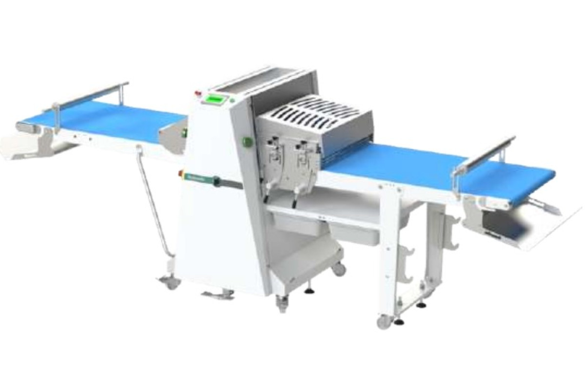 3880х1040x1243 (2300мм высота с поднятыми столами) мм, стол 650х1600 мм, 230В, 2 кВт, автомат, инвертер регулировки скорости, в комплекте со станцией нарезки и набором ножей для нарезки заготовок-треугольников под круассаны размером 140*130мм.
